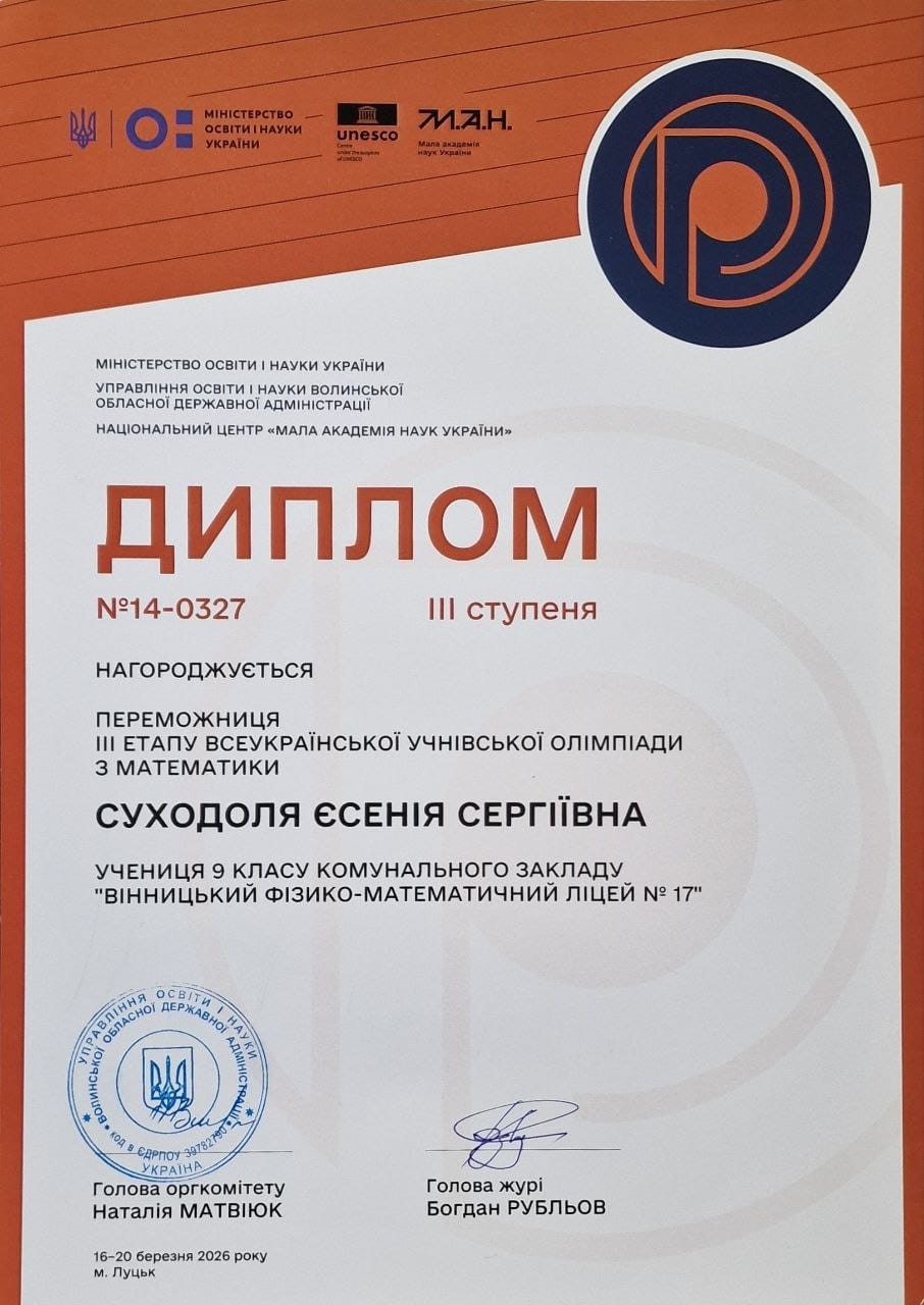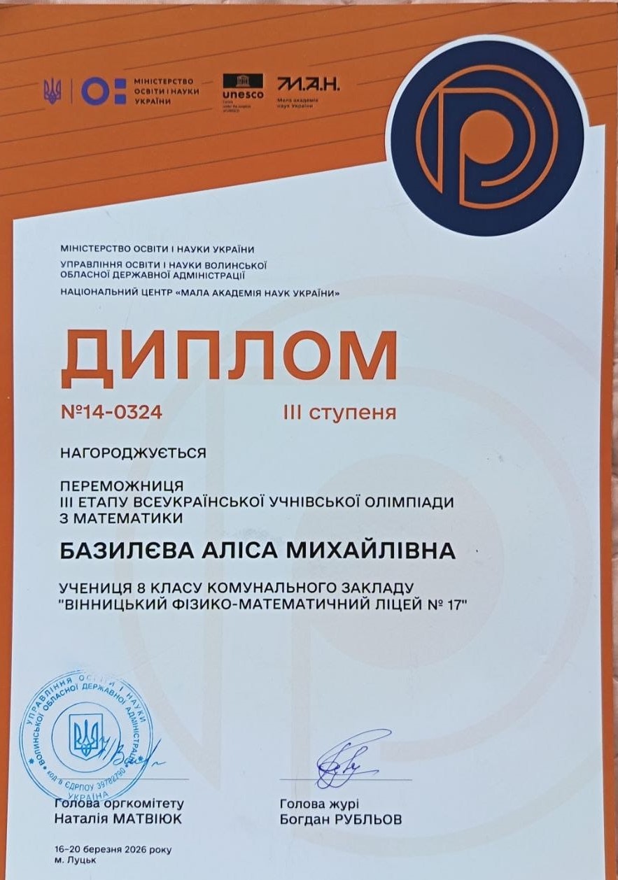 Третє місце в олімпіаді здобула учениця 8 класу Комунального закладу «Вінницький фізико-математичний ліцей № 17» Базилєва Аліса Михайлівна. До участі в інтелектуальному змаганні її підготувала вчителька математики Аліна Дмитрук.