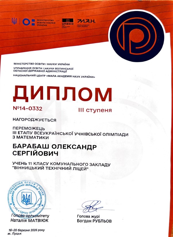 Ще одним призером став Барабаш Олександр Сергійович, учень 11 класу Комунального закладу «Вінницький технічний ліцей», який також посів третє місце. Його підготувала вчителька математики Світлана Кметюк.